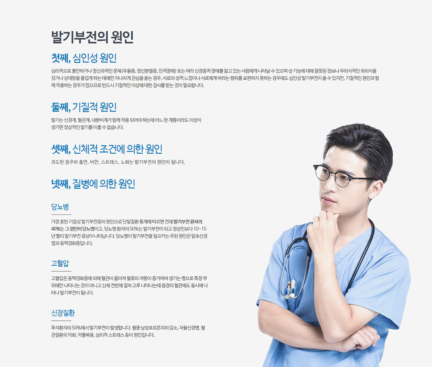 중년 남성들의 가장 큰 고민으로 문제가 신체적인 경우 음경에 연결된 혈관이 좁아져 충분한 혈액이 음경을 채우지 못해 발생하는 경우가 많지만,